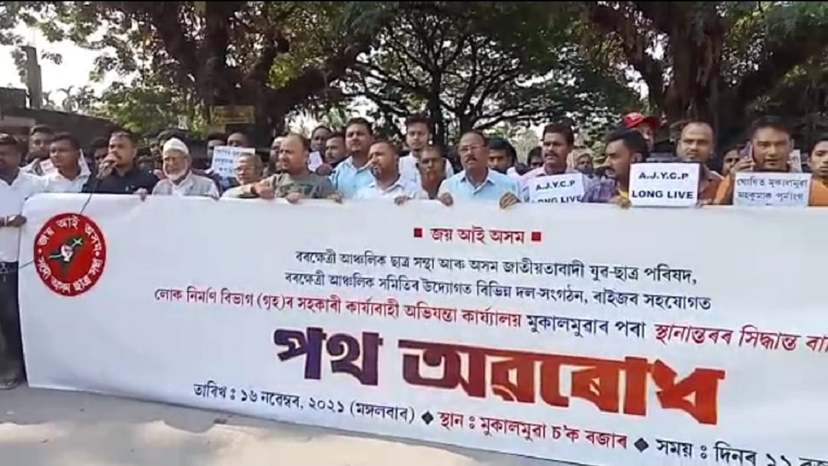 মুকালমুৱাৰ পৰা চামতালৈ লোকনিৰ্মান (গৃহ) বিভাগৰ কাৰ্যালয় স্থানান্তৰৰ প্ৰতিবাদত এই পথ অৱৰোধ কাৰ্যসূচী ৰূপায়ন কৰে।