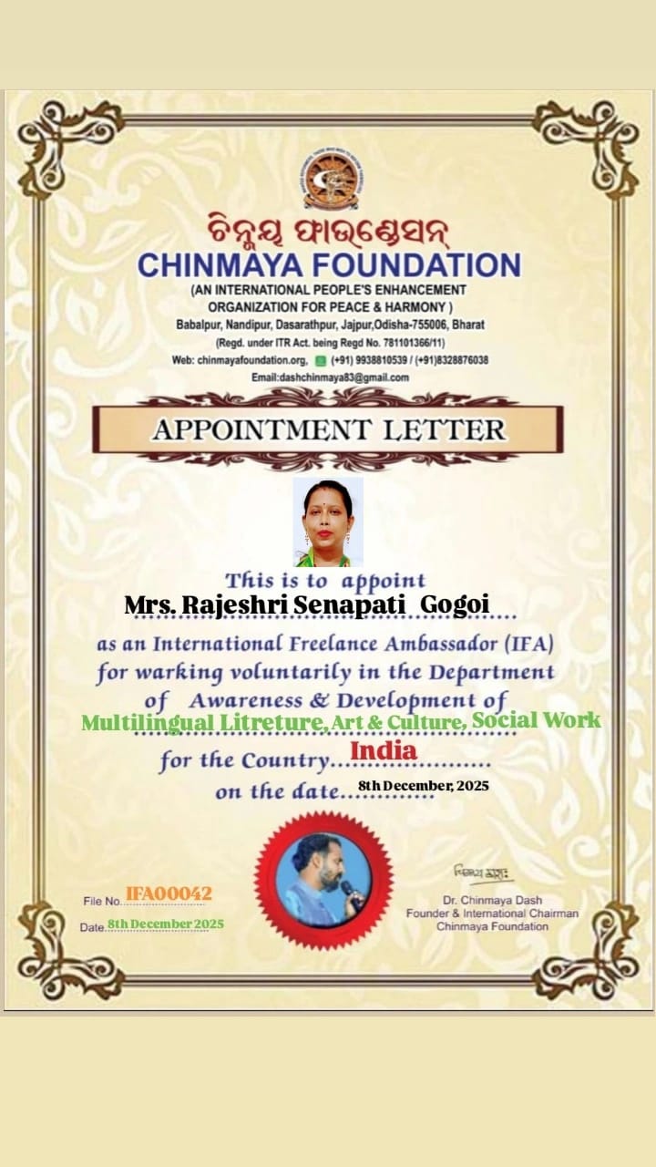 ■ ৰাজশ্ৰী সেনাপতি গগৈ, ২০২৫ চনৰ ৮ ডিচেম্বৰত ভাৰতৰ বাবে বহুভাষিক সাহিত্য, কলা আৰু সংস্কৃতিৰ সামাজিক কামৰ সজাগতা আৰু বিকাশ বিভাগত স্বেচ্ছামূলকভাৱে কাম কৰাৰ বাবে ফ্ৰীলান্স এম্বেছাদৰ (আই এফ এ) হিচাপে নিযুক্তি লাভ কৰিছে।