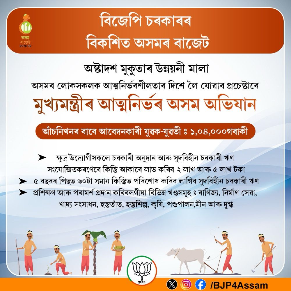 মুখ্যমন্ত্ৰীৰ আত্মনিৰ্ভৰ অসম অভিযানৰ অধীনত যুৱ ক্ষুদ্ৰ উদ্যোগীসকলে চৰকাৰী অনুদান আৰু সুদবিহীন চৰকাৰী ঋণ সংযোজিতকৰণেৰে কিস্তি আকাৰে লাভ কৰিব ২ লাখ আৰু ৫ লাখ টকা।