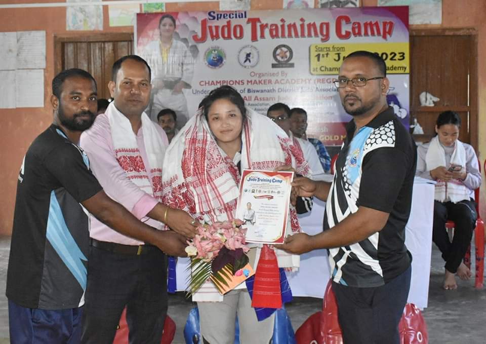 ৩৩ সংখ্যক ৰাজ্যিক জুডো প্ৰতিযোগিতাৰ লগত সংগতি ৰাখি বিশ্বনাথৰ প্ৰায় ১ শতাধিক জুডো খেলুৱৈৰ মাজত অনুষ্ঠিত বিশেষ জুডো প্ৰশিক্ষণৰ আজি সফল সামৰণি পৰে। বিশ্বনাথৰ ৰাষ্ট্ৰীয় বিদ্যালয়ত অনুষ্ঠিত এই বিশেষ প্ৰশিক্ষণৰ সামৰণি অনুষ্ঠানতে আজি ৭ দিনীয়া বিশেষ প্ৰশিক্ষণৰ সন্মানীয় প্ৰশিক্ষক হিচাপে উপস্থিত থকা অৰুণাচল প্ৰদেশৰ এন আই এছ প্ৰশিক্ষক অঞ্জলি ছাগ্ৰো আৰু ৰাষ্ট্ৰীয় খেলুৱৈ কবি দয়মক তেওঁ লোকৰ সহযোগিতাৰ বাবে চেম্পিয়ন মেকাৰ একাডেমীৰ তৰফৰ পৰা স্মাৰক, মানপত্ৰ আৰু গামোচাৰে সম্মান জনোৱাৰ লগতে উপস্থিত ছাত্ৰ-ছাত্ৰীয়েও উস্ম আদৰণী জনাই। আজিৰ এই সামৰণি অনুষ্ঠানত উপস্থিত থাকি চেম্পিয়ন মেকাৰ একাডেমীৰ উপদেষ্টা তথা বিশ্বনাথৰ বিশিষ্ট সমাজকৰ্মী নিৰঞ্জ্ন হাজৰিকা , অজিত দাসে প্ৰশিক্ষাৰ্থী সকলক দিয়া শুভেচ্ছামূলক বক্তব্যই উৎসাহিত কৰি তোলে।